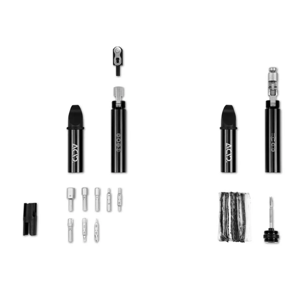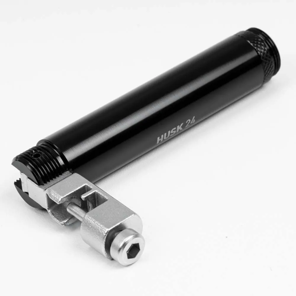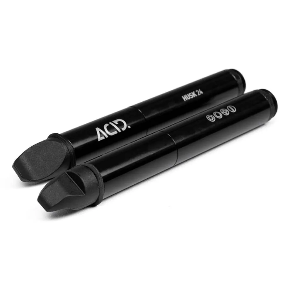 ACID Multi Tool HUSK 24: un kit de herramientas premium pero compacto con un diseño súper genial. Los dos tubos de metal con palancas para neumáticos en cada extremo se ajustan perfectamente a su mano. En el interior, encontrará otras 23 funciones, todas perfectamente protegidas contra el polvo y la suciedad. La herramienta de cadena y la extensión de broca se abren 90° para un mejor apalancamiento. Los dos tubos HUSK 24 se pueden ocultar dentro del manillar con ACID GILink para HUSK o se pueden montar en el portabidón con ACID Frame Mount.