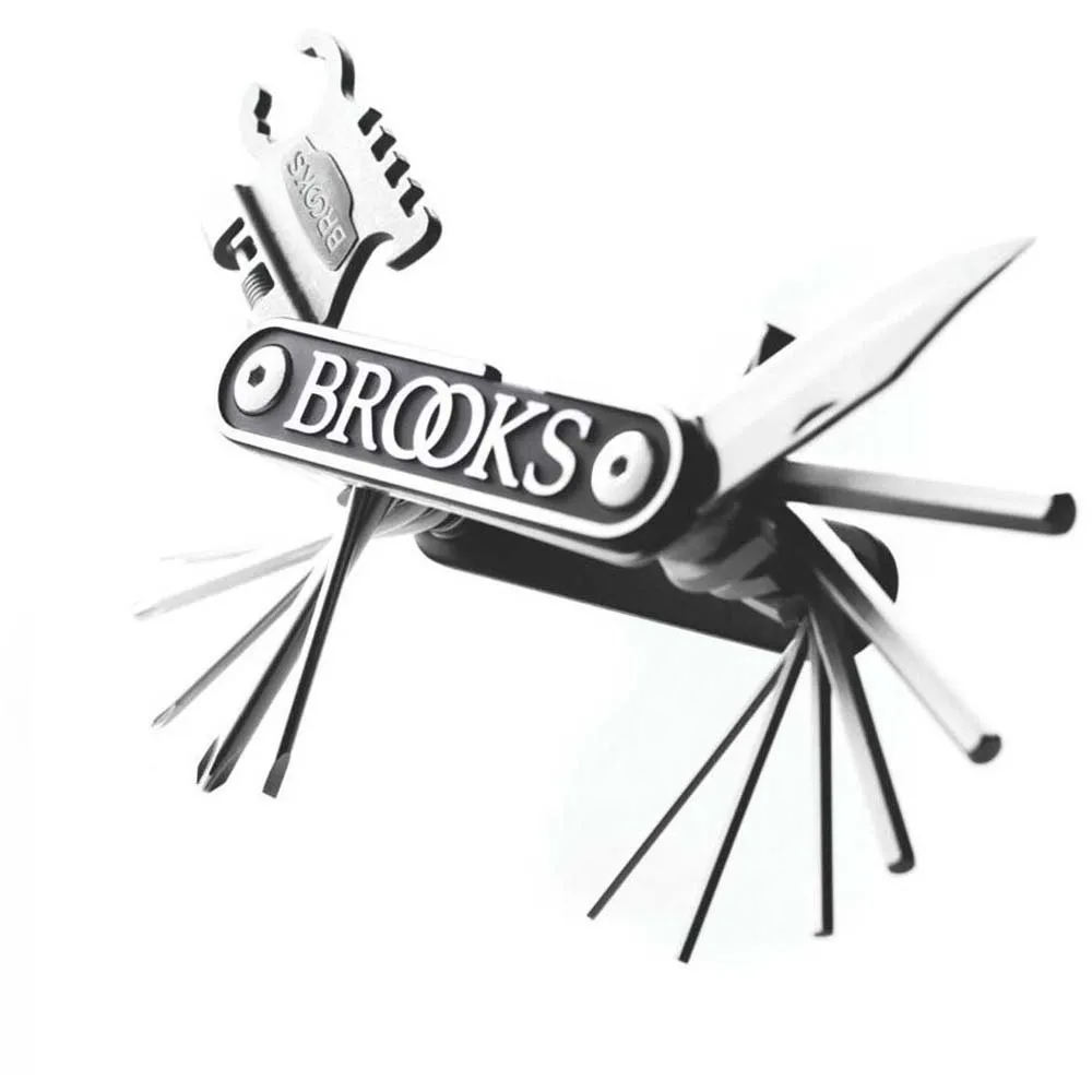 7 llaves Allen / llaves hexagonales: n.o 2, 2.5, 3, 4, 5, 6, 8 3 destornilladores: destornillador pequeño de cabeza plana, destornillador Phillips n.o 2 (cabeza mediana), destornillador Phillips n.o 1 (cabeza pequeña) 3 llaves Torx : T10, T20, T25 Llaves de 4 radios: # 0, 1, 2, 3 Llave abrebotellas para herramientas de cadena para cuchillo Brooks Saddles