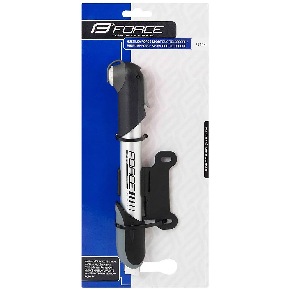 Minibomba telescópica SPORT DUO de FORCE con cabezal reversible compatible con todo tipo de válvulas (AV – Schrader, FV – Presta, DV – Dunlop).