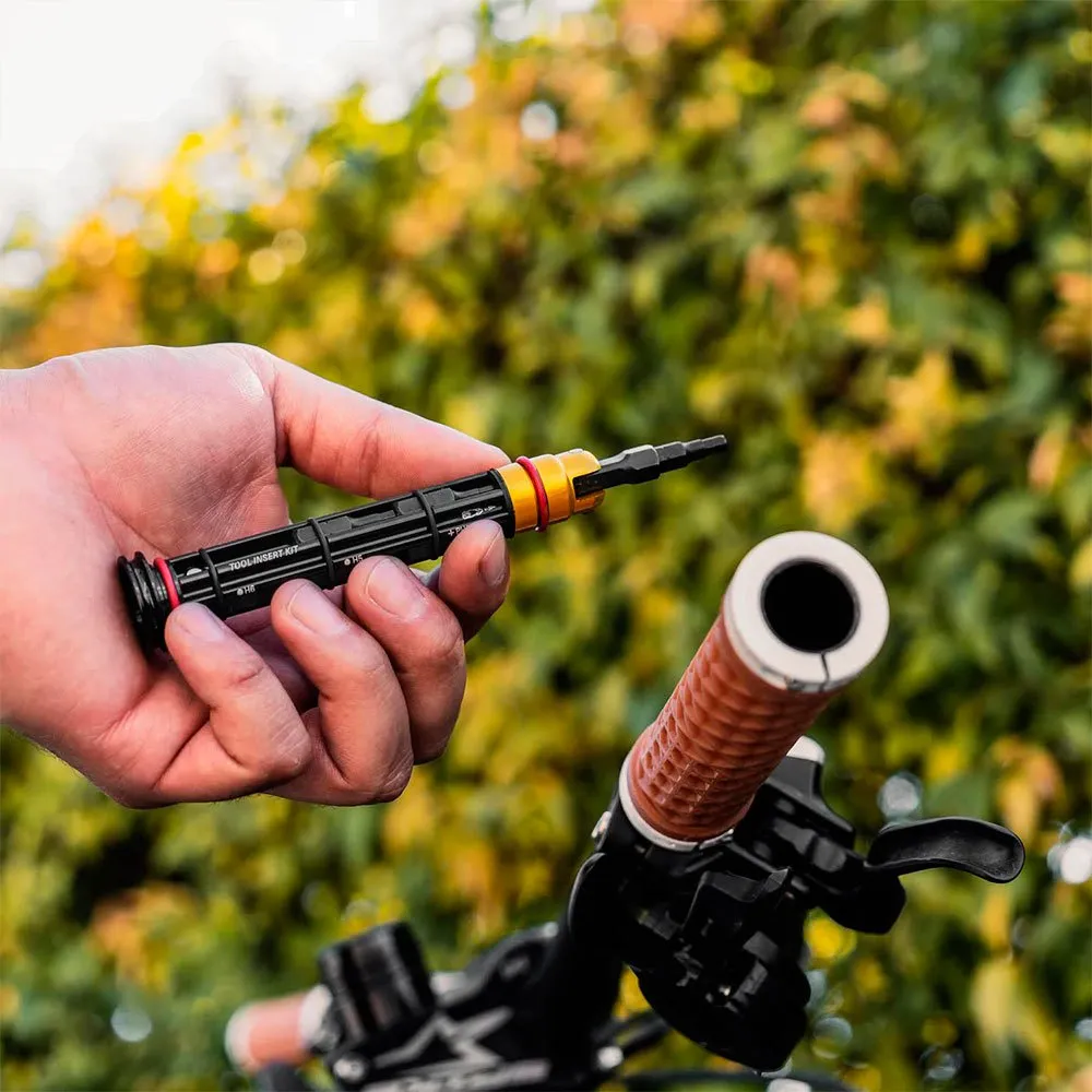 El kit de inserto doble es el conjunto de herramientas definitivo para bicicletas de montaña montadas sigilosamente que cuenta con un par de nuestras innovadoras herramientas que se esconden de manera discreta y segura en los extremos de un manillar: el kit de inserto sin cámara y el juego de inserto de herramienta.