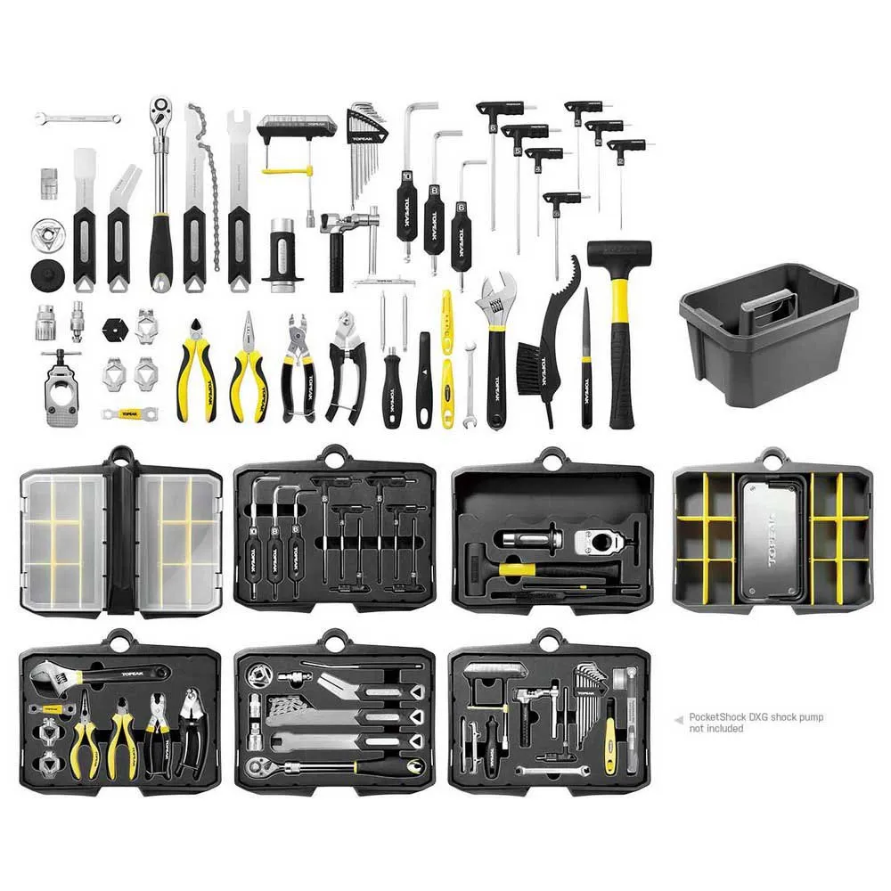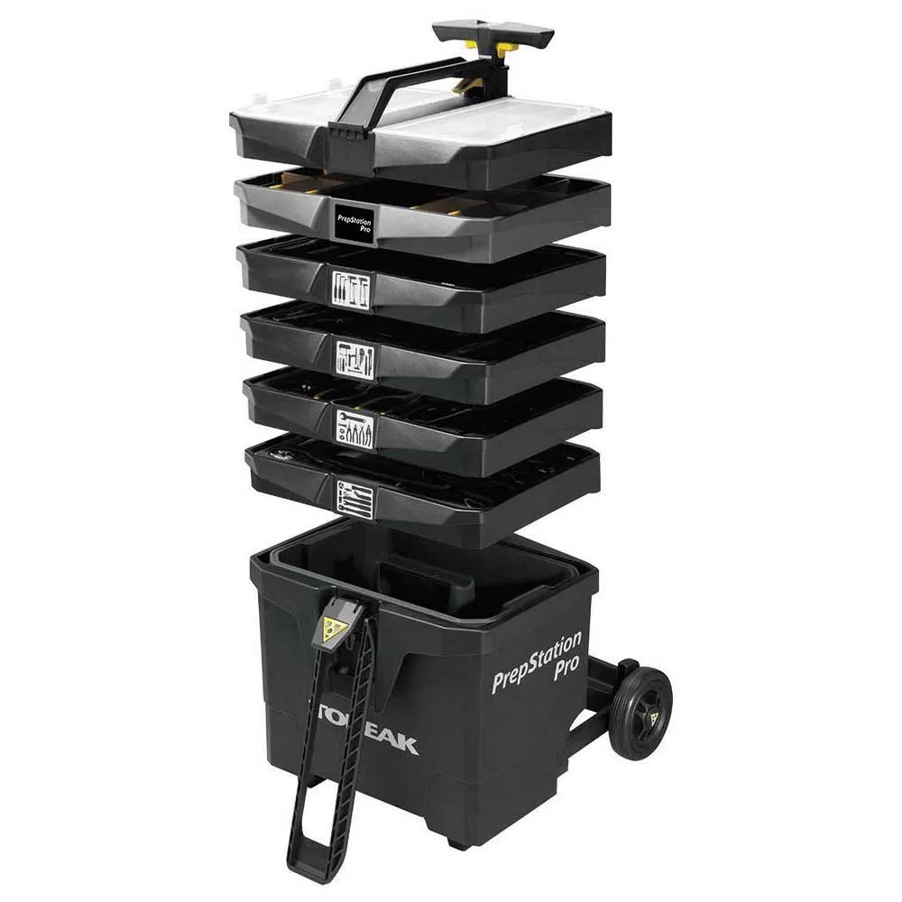 Estación de herramientas con carro de fácil movimiento con ruedas de 5” y siete compartimentos para herramientas que contienen 55 herramientas profesionales para bicicletas con calidad de taller (85 funciones). La base de la rueda se puede sacar fácilmente para extender la base de trabajo para una mejor estabilidad. El mango de elevación con botón abre las bandejas de herramientas para reparaciones rápidas y sencillas.