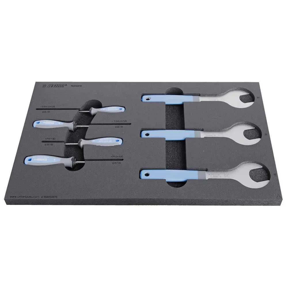 Tomamos las herramientas de nuestro banco de trabajo mecánico profesional y adoptamos los insertos SOS para encajar en los cajones de nuestros carros. La selección de herramientas ahora está disponible en siete bandejas individuales hechas de espuma de alta calidad (desde el modelo 1600sos13 hasta el modelo 1600sos19), donde cada herramienta tiene su propio lugar. Las bandejas de espuma se adaptan a nuestros carros Europlus, Eurovision, Eurostyle y Hercules.